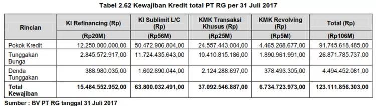 Ketiga, pabrik tidak beroperasi selama 2 tahun berdasarkan hasil cek fisik agunan dari Bank DKI pada tanggal 9 September 2016. PT RG memiliki total kewajiban kredit per 31 Juli 2017 sebesar Rp123.111.856.303,00 dengan rincian tertera dalam tabel berikut.