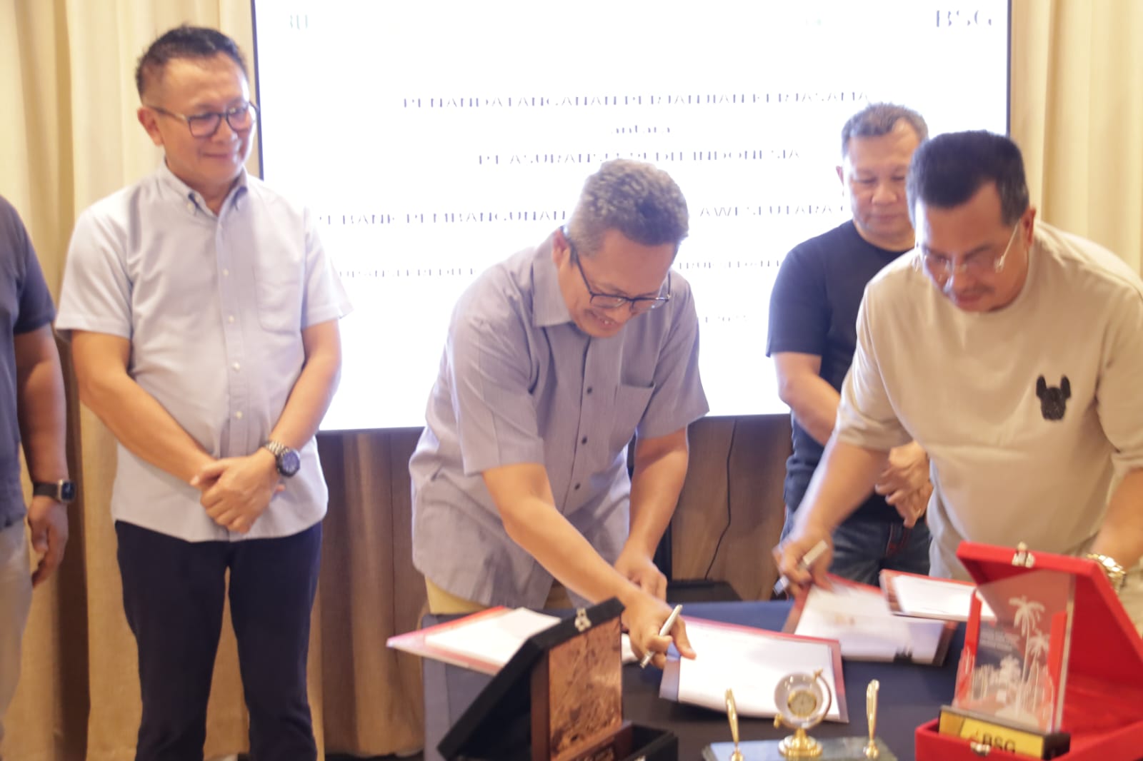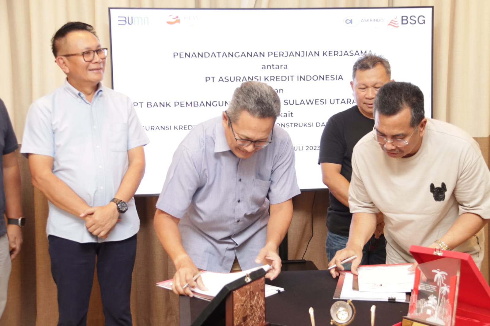 Penandatangan Kerjasama ini ditanda tangani oleh Direktur Operasional Askrindo, Erwan Djoko Hermawan dengan Direktur Utama Bank SulutGo, Revino M. Pepah bersama Direktur Pemasaran Bank SulutGo, Pius S.L Batara yang disaksikan oleh Komisaris Independen Askrindo Renny Octavianus.