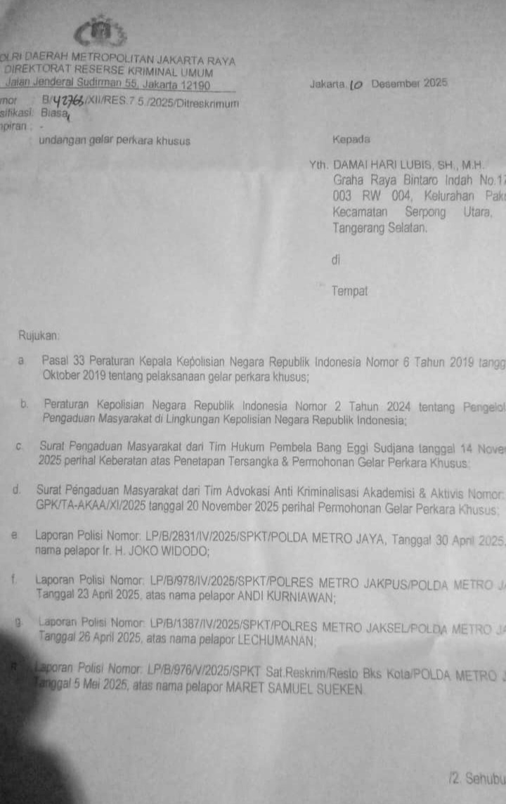 KNews.id – Jakarta , Ada undangan kemarin (11/12/2025) Gelar Perkara Khusus dari Dirreskrimum Polda Metro Jaya untuk gelar perkara yang ditujukan kepada 8 orang Tersangka (TSK) agar hadir pada hari Senin, 15 Desember 2025.